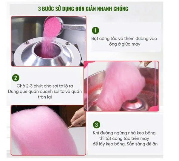 Cách hoạt động đơn giản: chỉ cần cho đường, màu thực phẩm và chuẩn bị sẵn 1 que dài. Cho đường vào ngăn giữa máy, bật công tắc khởi động máy. Sau 2-3 phút sợi bông bắt đầu bung ra khỏi ngăn đường. Dùng que quay cuốn sợi bông cuộn tròn lại thành hình mà mình thích. Khi đường đã nhả hết sợi thì tắt máy.