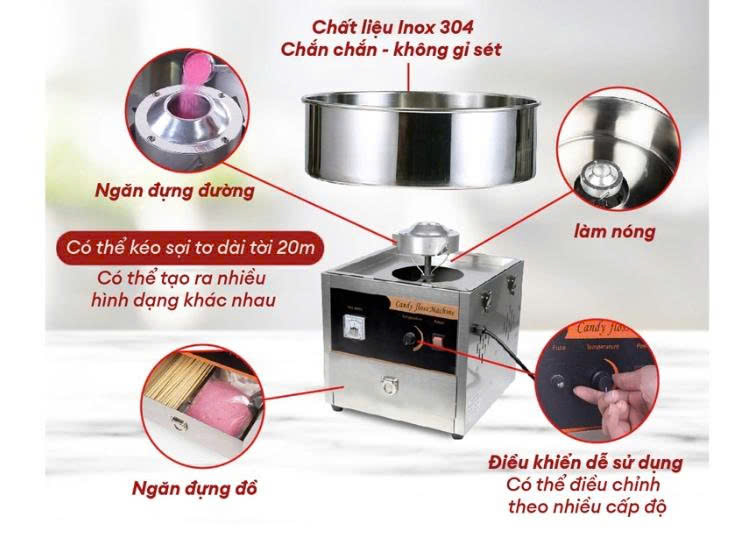 Máy làm kẹo bông hoạt động với công suất 1.000W, thiết kế máy từ các chất liệu cao cấp, an toàn với thực phẩm. Máy có thể sử dụng tại gia đình hoặc dùng để làm kinh doanh khi tổ chức hoạt động cho trẻ nhỏ.